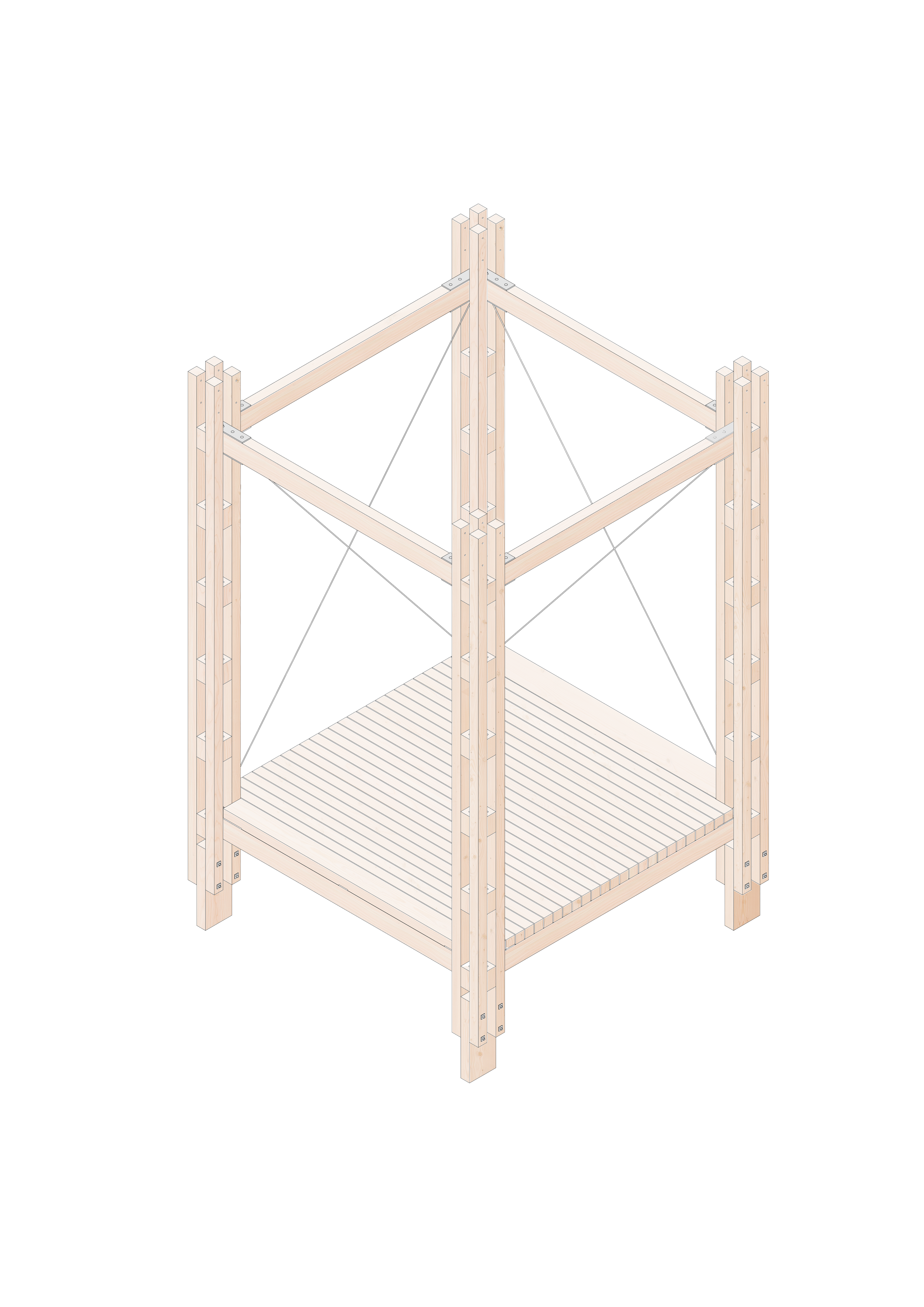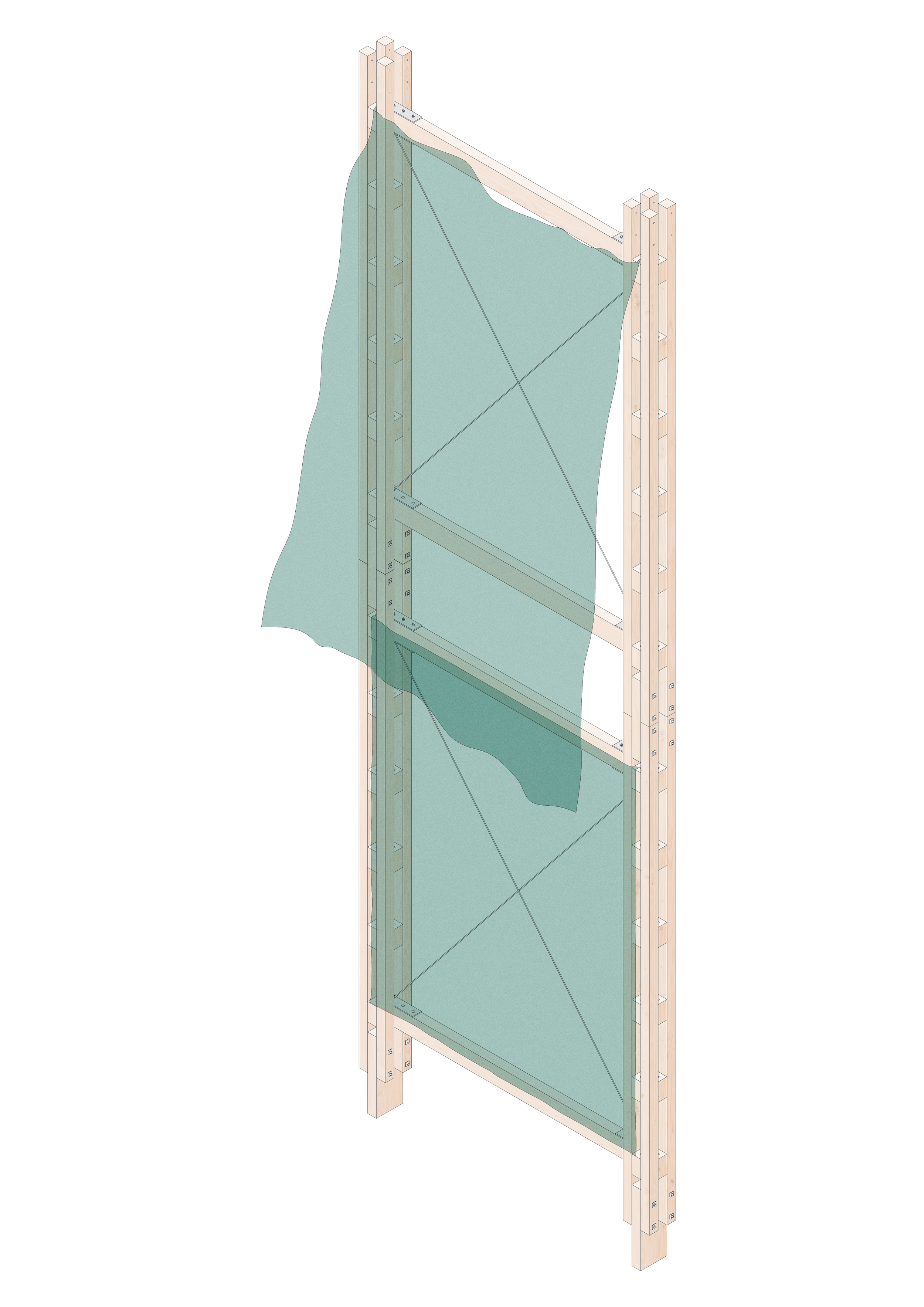 Modular framework for festival pavilions utilizing discarded scaffolding sheeting. The system was designed to be adaptable, cheap to build, designed for disassembly, efficient to store(flat-pack-able), reusable and eco friendly.