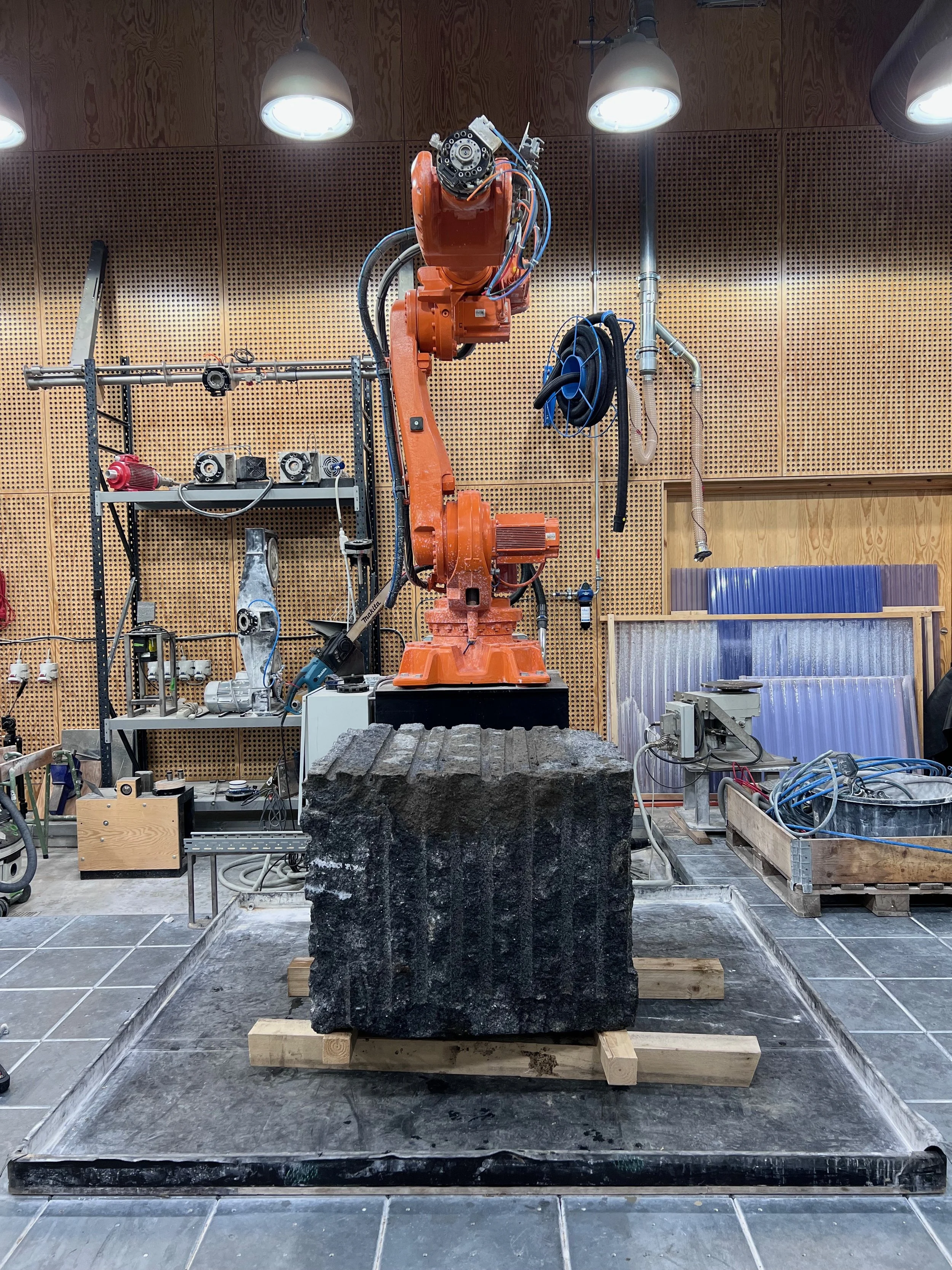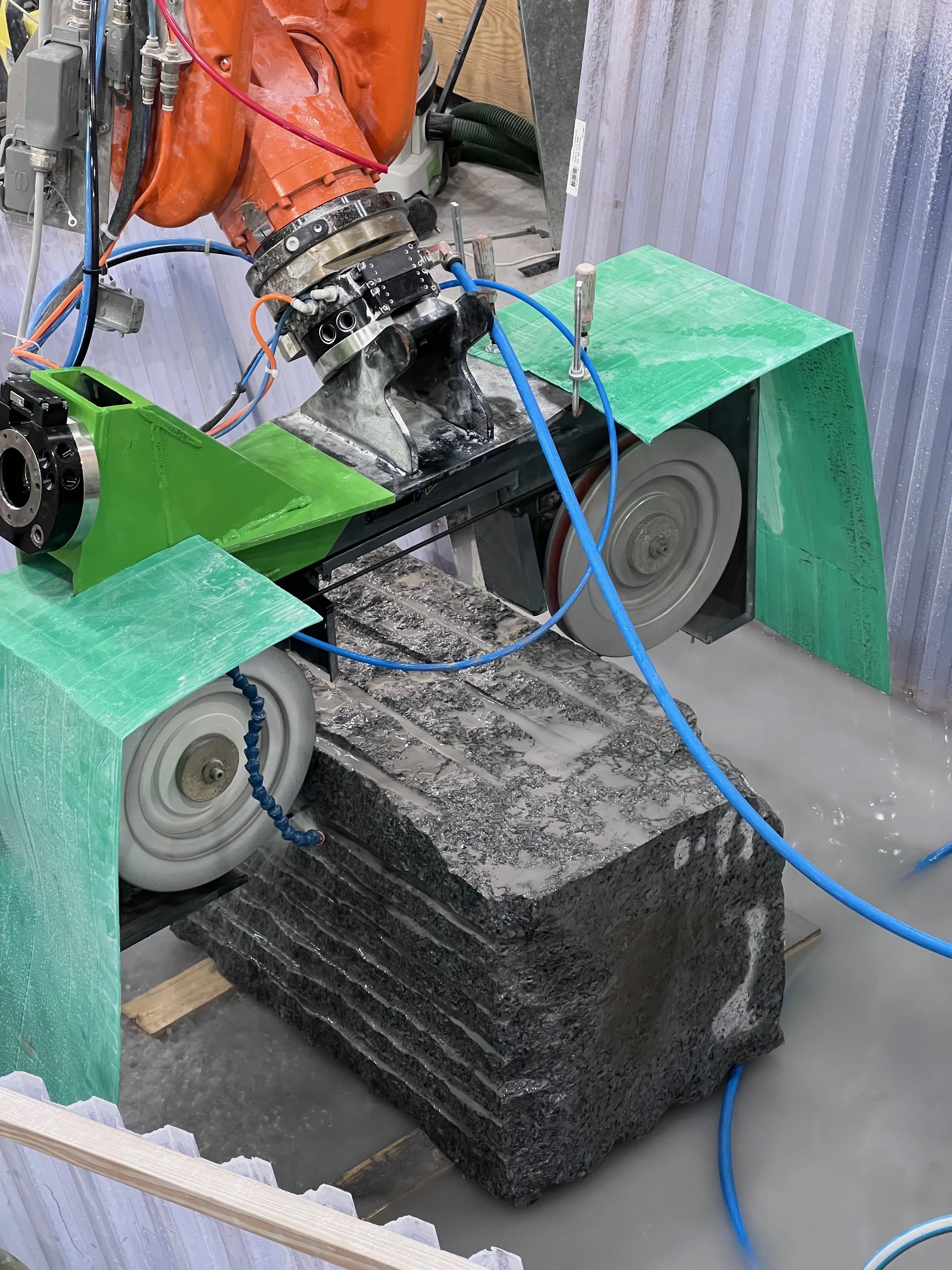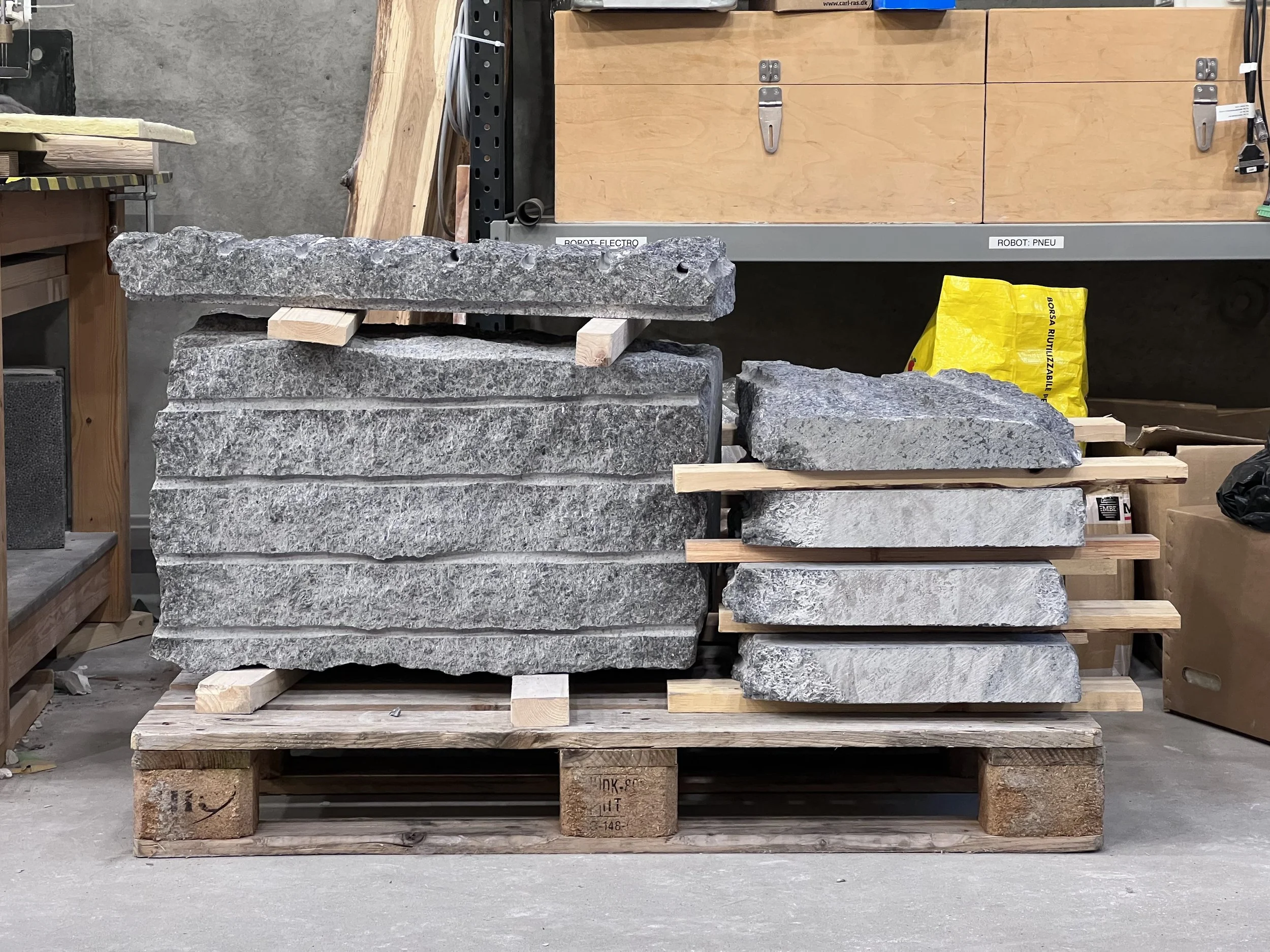 We liked the idea of using the stone slabs as is, without cutting them to shape. Both as a way to minimize waste but also to explore an aesthetics usually attributed to a trained human eye laying flagstone pavers.