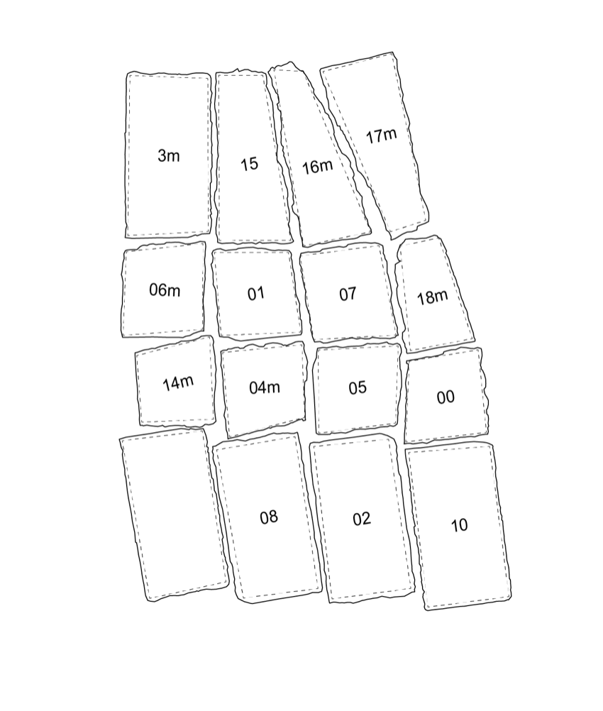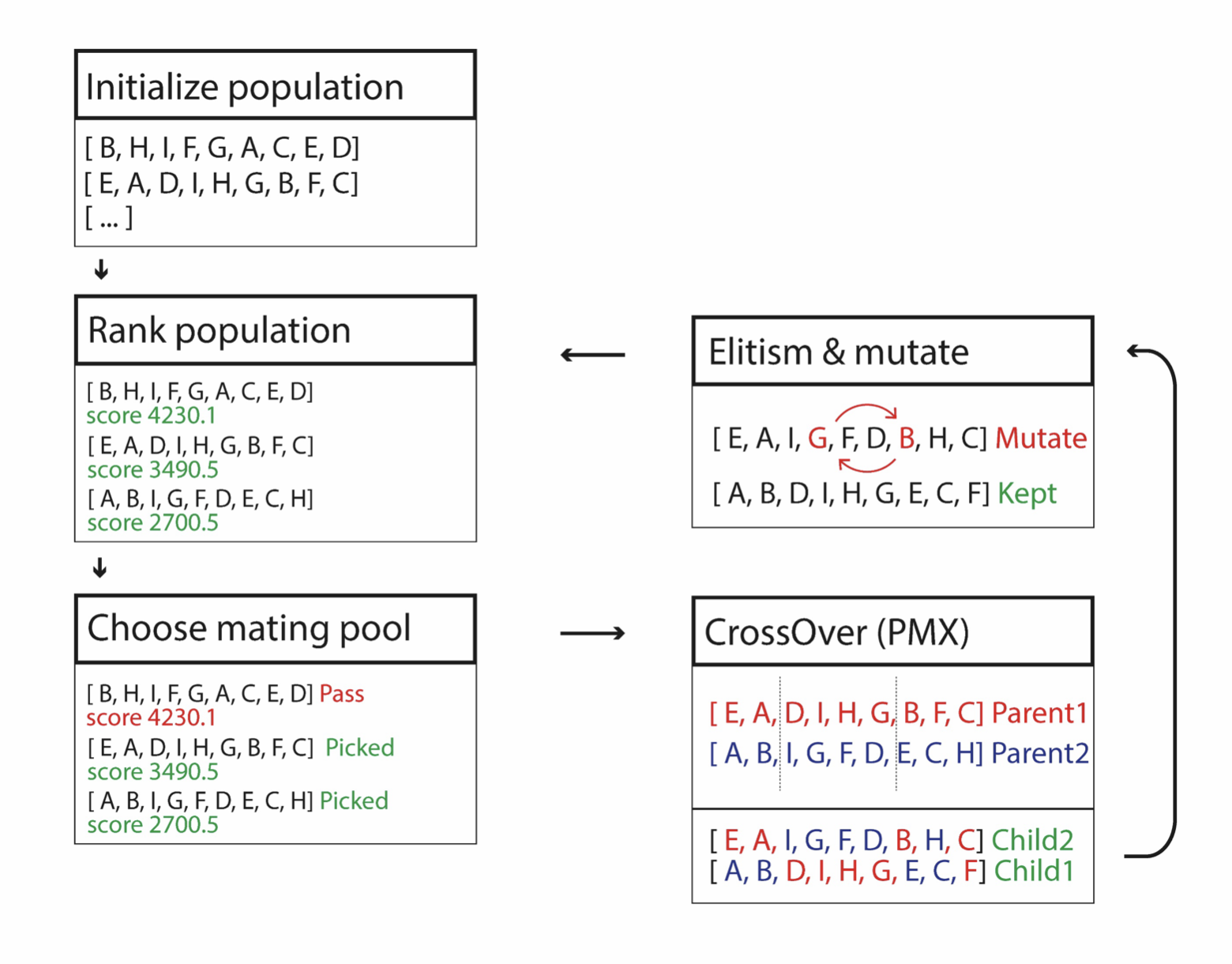 A diagram of the genetic algorithm used to find the final slab configuration. The different letters A, B, C, D… represent a unique slab. It’s essentially a guide for placing the real stones. [A, B, C, D, E, F] indicates that stone A goes in the first spot, and so on. If a set of stone ie [E,A,C,D,B,F] gets a good score after the ranking step, its granted a higher probability to pass on some of itself to the next generation. Thousand of these generations are needed to find a good solution.